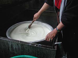 実はチーズの作り方をよく知らないTakemaゆえ、たぶん話がぶっ飛んでいると思われますが、暖められた「原チーズ」ともいうべきものをおばさんが攪拌している図。何だかヨーグルトみたい。