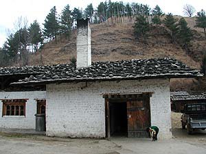 「工場」といっても規模そのものはそれほど大きくありません。「町工場」というくらいの表現が適切ですね。屋根に石がのせられているのがブータンらしいのですが、煙突があるのが普通の民家と違うところ。