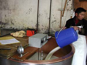 搬入された牛乳は、まず不純物を取り除いたあとで、計量しながら大きな釜?に注ぎ込まれます。左写真のおじさんが腰に剣を下げているあたりは、いかにもブータンらしいところです。釜の温度は20℃に設定されていました。