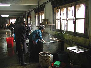 工場内はこんな感じ。ほこりが立つのを防止するためか場内にはきちんと水が撒かれており、朝一番とはいえ何だか魚市場のような活気を感じさせます。