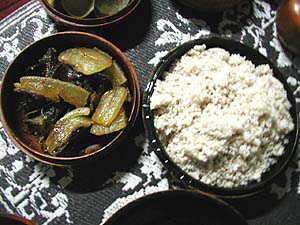 おしんこどんはまだ別のモノを食べていますからいいですけれどね、右写真の左側に写っている「おかず」は?(もちろん右写真にマウスオンするとアップします)