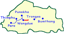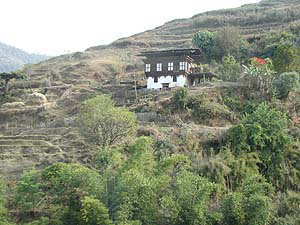 さて、ワンジュから東に向かう道はいきなり絶壁の途中をいく激しい道になります。ちなみに、パロからブムタンの一連の道路状況の中で、一番整備が良くないのがこのワンジュ〜トンサの間という感じでした。舗装状態も良くないし、どこまでが路肩でどこからが崖なのかも判然としない道をいくのですが、その途中、眼下に見える川の脇にある学校のような建物、それは刑務所だということでした。中庭ではバスケットボールをやっているようでした。何だか楽しそうだったんだけれどな(苦笑)。