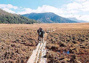 | (左写真) | 湿原のような所も通ります。緑の時期ならきれいだろうなぁ。 |