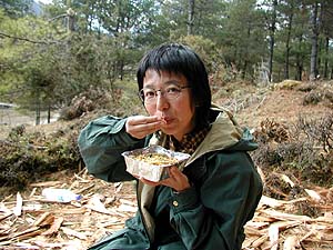 さて食事後です。燃えない(腐らない)容器などは持ち帰りますが、残飯は一ヶ所にまとめてそのまま捨ててしまいます。いや、捨てるというのは語弊があるかもしれません。人間と同じくらいに他の生き物を大切にするブータンの人々にとっては、これは他の生き物の取り分だよということで「置いていく」というほうが正しいのでしょう。他のHPでのブータン旅行記などでも、残飯に関する処理については同じでした(ただし街中では違いますよ)。