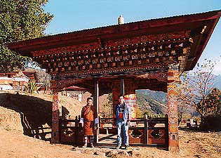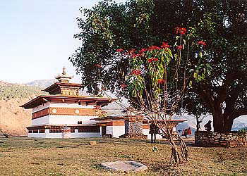 目次でも書いたとおり、ドチュ・ラ(3050m)からは長い峠道をとにかくひたすら下ってきます。何といってもプナカの標高が1300mくらいですから、一気に1700m!峠付近は針葉樹林に覆われていたのに、下るにつれて照葉樹林へ、そして棚田の稲作地帯へと風景がめまぐるしく変わっていきます。さっきまで道の横に雪があったのに、それから1時間後にはポインセチアの群落があったりするのもここブータンならではというところですな。そして広い谷あいまで降りてきた分岐のところ(ロベサという地名らしい)でプナカ方面へと向かうことになるのですが、まずはここで最初のお寺見学ということに。