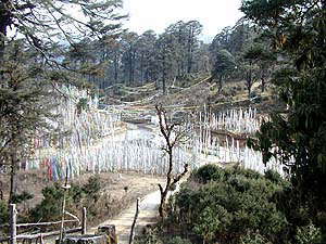 日本の山なら、わっせわっせと背中の重荷に耐えて耐えて耐えかねたあげくの末にようやくたどり着く標高3000mの高み‥のはずなんですが、ここブータンでは別にそう大騒ぎするほどの高さでもありません。そりゃそうだ、首都よりたった700mほど高いだけなんだもの。しかし、先ほどのゲートのあたりの松林とは植生も全然違い、このあたりは針葉樹林に寄生植物のサルオガセが垂れ下がる、高山特有の雰囲気になっています(日本でも北海道の根室沿岸では海岸沿いに似たような風景が広がっています=北太平洋シーサイドラインの東側)。