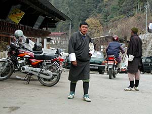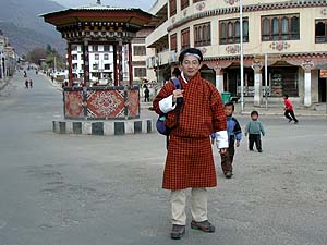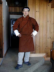 ブータンでは「ブータン人(の大人)」に対して、民族衣装の着用義務があります。成文化されているかどうかはちょっと忘れましたが、とにかく外出する場合は着用が義務というわけです。ただ、聞いた話では「ティンプーでは、午後7時以降の外出についてははまぁ何とか云々ですね」というような微妙な例外があるみたいでした(暗くなるとよくわからないからかな)。なお、家の中では特に制限はないそうです(そりゃそうだ、チェックもできないしね)。ガイドのカルマさんもご自宅ではしっかりくつろぎ服でした。