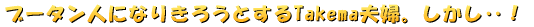 続いてTakema。一応ちゃんとした格好のようにも見えますが、現地の人が見たらすぐに「ん?」と気付くことでしょう。それは、下にはいているGパン。現地の人はタイツとロングソックスが基本のようです。いろいろな文献やホームページを読むと「ズボンをはくことも違反ではない」ようですが、少なくともズボン姿の地元の人はいなかったからなぁ。