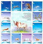 上の十二支ものと同じパターン。お犬様の周りを十二支がぐるっと取り囲んでいます。しかし、二本足で直立姿勢というのも意味ないなぁ(笑)。ちなみにこの年は真ん中の一枚だけが切手になっていて、周囲は全部飾りです。