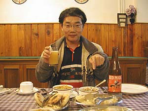 というわけで、人通りの絶えたメインストリート散策のあとは、宿に戻って夕食です。今日はチベット料理のオンパレードということで、モモやらトゥクパやらカプタムなどがどどっと出てきました。ついでにしっかり激辛のイヅィも。モモはチリソースをつけて食べるのがこちらの標準ですが、せっかくなのでこれまた持参の醤油で食べます。なお、左写真にマウスオンで料理の写真に切り替わります。