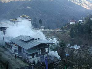 宿の部屋の窓から。朝からたき火をやるのはいいんですが、火付きが悪いらしく煙ばかりがもうもうと立ちのぼっています。よく見ると、その煙の中に洗濯物が燻製状態になってますが、全く気にする様子もありませんね(笑)。上の写真にマウスオンでその様子がわかります。