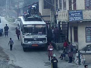 早朝のトンサからは各方面に向けて長距離バスが発着するため、町全体が活気にあふれています。屋根に荷物を載せるのはアジア的な風景ですが、バスは総じて新しいものが多いようです。専用車が用意される旅行者がバスを使う機会はほとんどないんですけれど、何だか乗ってみたいなぁ(右写真にマウスオンしてね)。
