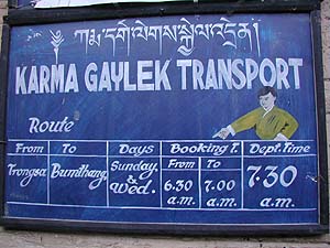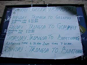 こちらがバスの時刻表。トンサ〜ブムタンを結ぶローカルバスは週に2本しか出ていないみたいですね。こりゃ不便だわ。ちなみに一番上の「Gelephu」というのはブータンとインドの国境の町。しかしそちら方面へは一般旅行者の立ち入りが認められていません。