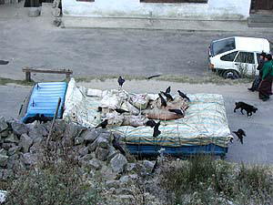 下側の道に停められているトラック。その荷台になぜだかカラスが集まってきています。遠くから見ると何があるのかわかりませんでしたが、よくよく眺めてみると(マウスオンしてみて下さい)、あれま、大ご馳走が積まれていたのか!しかし、こんなに無防備なまま積みっぱなしにしておくとは何ともおおらかな持ち主だこと(笑)。