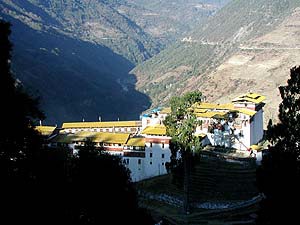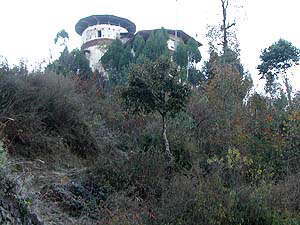 登っていくと徐々に展望が開けてきます。眼下にトンサ・ゾンも見えてくると同時に、そのはるか奥にはプナカ・ティンプー方面に戻るメイン国道が延々とのびているのが見えます。今日はティンプーまで行くのですからあまりのんびりしてもいられないのですが‥