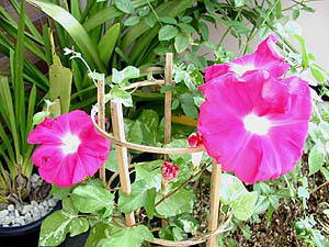 入谷の朝顔市で買ったアサガオもその例外ではありませんでした。4種植えの鉢の中で3種はすでにご臨終状態、残りの1種もすでにほとんど葉を落とし、余命幾ばくもない状態でした。そのアサガオが、その後一所懸命に水をやるに従って息を吹き返し、再び少しずつ葉を付け始め、そして、この9月下旬から10月上旬にかけて一気に再開花の季節を迎えていたのです。