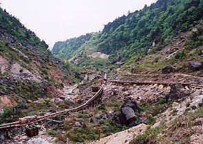 さて、名残はつきねど悲しき日帰り旅行@遠出なんだから早めに帰らなきゃということで、今度は谷沿いの道を帰ります。道の横には温泉街に延びるお湯の配管が続いていて、触ってみると塩ビ製のそのパイプ自体がかなり熱を持っています。「夏の暑い日だったら、この道を歩くだけで暑いんだろうなぁ」と実感。