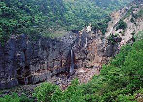その「旧崩落現場」を通ってしばらく行くと、「白糸の滝」がとてもよく見える場所があったりします(左下写真)。そしてもちろん、あそこを流れる水は、ついさっきまでうちらが湯ったりしていた、あのお湯に違いないのです。