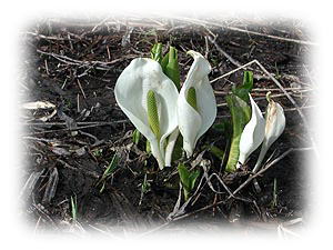 清冽な小沢の流れ沿いに水芭蕉の群落が色を添える。