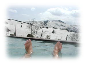 さて、そのあとはいよいよ温泉。先日は肘折温泉・荒湯地獄・小安峡温泉公衆浴場・キャンプ場の湯と、一日に4つ入ったわけだけれど、今日は朝一番にキャンプ場の湯に入ったきり。だから硫黄臭の濃いこの温泉で、是非ともきちっと事を済ませておきたいところなのだ。入浴料は結構高かった。GWだからそれなりに混んでいた。でも、露天風呂はヨカッた。こんな感じだ。