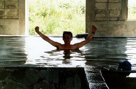 これも奇怪な温泉だったなあ。昨年版(1998)のマップルにも「奥摩周温泉」って載ってますよね。で、そのマークのある場所はR241のすぐ南側。よし行ってみるか!と国道から直線ダートを約100m。そこから奥は「奥摩周文化村」っていったか、芸術家達のアトリエ兼自宅らしいものがいくつもあるみたいなんだけれど、とにかくその入り口にそれはありました。お湯と水とを自分たちで入れるシステム。家庭用にしちゃ大きいステンレス浴槽が大小会わせて2個無造作に置いてあるだけ。勝手にやってくれってことなんですが、とにかく国道から丸見え。でも、国道走ってるライダー達はどんどん通り過ぎて行くばかり。「ふっふっ周囲の景色に注意していないから気づかないんだよ」とちょっとした優越感に浸りながら湯につかる。そうそう、この時はご夫婦の旅行者が入りに来て、なぜか奥さんだけが入ったのだ。もちろんこの写真を公開する許可は得ていないから顔は隠しておきますが、なんだか人妻とお風呂入ってる写真を、その夫に撮ってもらうという、一種不思議な体験でした。嬉 しかったけど(しょーがないなあ(^_^;))。ちなみに1998夏現在、跡形もありませんでしたから完全に撤去しちゃったんでしょうね。残念。