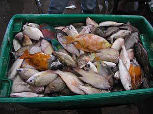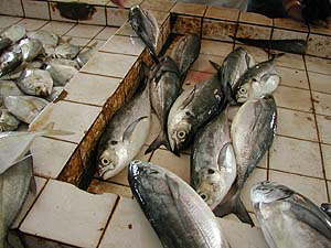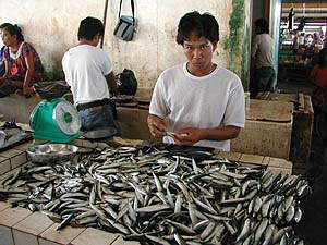 まぁそんなこんなでマブール島行きのボートが出るセンポルナに到着です。で、ここまでの車もそうだったのですが、どうやら雰囲気的にはボートも貸し切りみたい。どうやら他の乗客のことは考えなくていいようなのでちょっとわがまま。「あのぉすみません、マブールに行く前に市内、特に市場あたりをうろうろしてきたいのですが」と申し出ると、どうぞどうぞと快諾!しかも歩いても数分なのに市場まで車に乗せていただき、さぁ来たぞ魚市場!