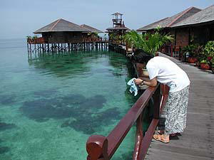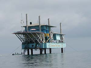 これこれっ!マブール島のすぐ沖にどどんと鎮座している「宿」。昔の調査船だか何だかをベースにして造ったとかいうことですが、確かに形は船っぽいです。しかし島の近くに構築されている建造物として違和感たっぷりなのは確かなことで、よせばいいのに夜はこうこうと灯りをともしますから、「うーんこれはコレハ」という感じです。ま、自分たちの部屋からは見えなかったから気にしなかったんですが(自己本位)。