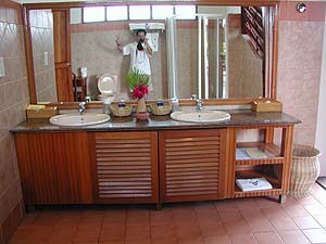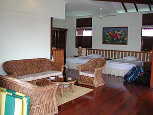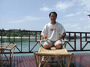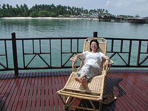 いやぁやっぱり我々のようなエグゼクティブにはあまりにもお似合い麦ばっかり食べてるようなビンボー人にはあまりにもおどおどするような雰囲気です。でもまぁ持参の屋久島焼酎を冷蔵庫に入れ@午後のシュノーケル後のお楽しみ、少しまったり。と、遠くのレストラン棟から「お昼だよーん、ごはんの準備が出来たよーん」を告げる太鼓の音が聞こえてきたので、わっせわっせとランチに向かう我々なのでありました。食事も全部込みになっているのでびくびくしないで食べられるぞぉ!(やっぱり小市民的思考ですな)。
