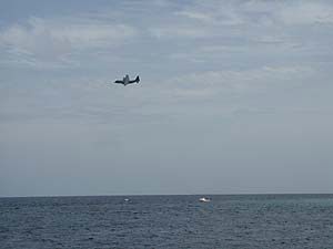 そんなこんなでのんびりしていたら、マブール方面からヒコーキが飛んできました。セスナよりもはるかに大きい機体ながらえらく低空飛行、かといってこの島に飛行場はない(あたりまえ)。何だ何だと思ってみておりましたのだ。