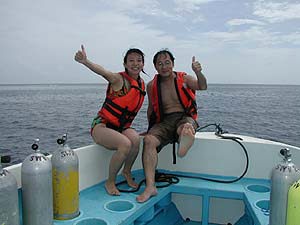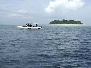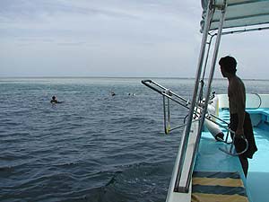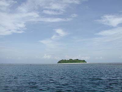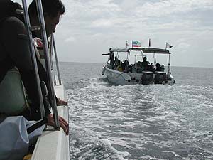 さて、話をシパダンに戻しましょう。一休みのあと、今度はダイバーさんと共に船に乗って島を離れます。とはいっても島の周辺は広い環礁になっていますから(ドロップオフポイントは唯一の例外)別に深いところに行くわけではありません。というか、今度は環礁の縁をうろうろというわけです。ダイバーさんは縁の下の方に潜るわけですけれどね。