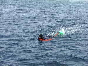ここからはみんなジャボーンと海に飛び込みます。よくこんな光景をTVで見ていて、「俺は足のつかないような場所で船からダイブすることは一生あるまい」と思っていたTakemaなのですが(笑)、ライフジャケット着用済であればなーんも恐いことはありません。勇気を出して(だから出す必要ないって)じゃぼーん!