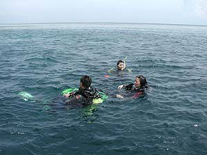 ちなみに今回のシュノーケリング地点は通称「サウスポイント」。島から長く延びた環礁が外洋に落ち込む場所です。ドロップオフポイントほど急激に沈み込んでいるわけではないので、ホントに浅いところから水深10mくらいのところまでをのんびりと見渡しながら楽しめます。水深こそ違え、活動場所がダイバーさんグループと全く同じところだったので何だかえらくなった気分(笑)。