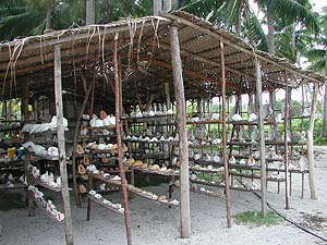 各家の造りはよくいえば素朴、有り体にいえばちょっと粗雑という感じで、余り豊かとはいえないかもしれません(ちなみに、島の反対側の村の方が家並みももう少し立派な感じ)。基本的に漁業を生業としているのでしょうが(というかそれしか考えられないよなぁ)、センポルナの市場に売りに行く‥こともそうそう出来ないでしょうしね。