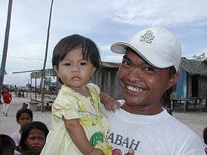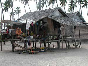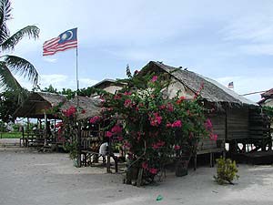 さてこのマブール島ですが、実はいくつかの宿泊施設以外にちゃんとした「村」が2ヶ所あります。この島全体の詳細説明については、わたしよりはるかに詳しいサイトがありますので是非そちらをご覧いただきたいわけですが(「サンダカン八番ガイド」>「コタキナバル他サバ州近郊ガイド>「マブール島」とお進み下さい。わたしがシパダン行きを決めたきっかけとなったぴあさんのサイトです)、ごく簡単に言えばうちらの宿泊するホテル(シパダンウォーターリゾート)のすぐ向かいに小さな村、そして島の反対側には大きな村があるというわけです。というわけでまずは目の前の小さな村へ。