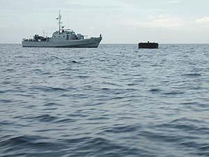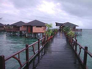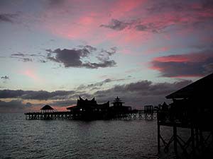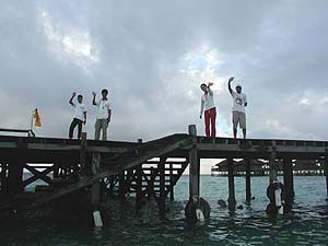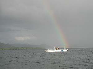 左写真は沖に停泊しているマレーシアの巡視艇。船の舳先に人影が見えますが、釣りをしていたのは彼だったりします(笑)。右写真のような虹はそれこそ10回以上見えたんじゃないかな。幸い自分たちのボートは濡れることもなくセンポルナへ到着することができました。
