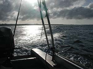 というわけで約30分のボートトリップがスタートです。この日はあまり天気が良くないようで、船から見渡す360度の海のあちらこちらで雨が降っているのが見えます。