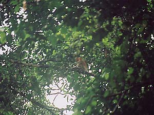 というわけでカメラをパシャパシャ。こんな時、たかが3倍ズームのデジカメは全然役に立ちません。というわけで一眼レフ+300mmのズームが役に‥たつわけでもなかったりして(笑)。いかんせん自分が付けているレンズは広角から望遠までを一気にこなす20-300mm。しかぁしその道に詳しい方ならご存知の通り、この手のレンズはとにかく「暗く」、雨のジャングルの林底から何かを撮ろうとすれば当然のごとくフラッシュ警告が。しかしフラッシュを焚こうがどうしようが、取りたい対象は数十m上にいるんですから関係ないんですが(笑)。しかも一脚も三脚も持参せず、全て手撮りでやろうというんだからそもそも無理があります(笑)。
