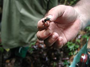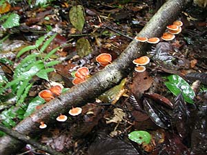 雨期は動物の動きも不活発ということで、「どうせいてもわからないだろうしなぁ」という気持ちで歩いていきます。ロボさんも時折上を眺めつつ、それでも何も見つけられないからか、ついつい説明は足元に。いわく「ほら、このアリは大きいでしょ」「こんなふうにキノコが生えてますねぇ、このキノコは××といいます」などの説明に終始。うーん名前はともかくとして、そういうのだったら自分でもわかるんだけれどなぁ。