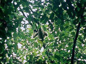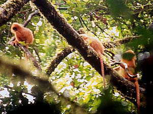 しばしご一緒させていただいたのち、我々一行は当初の目的地であるCaveを目指します。と、木の間ごしにクリイロコノハザルの群れを見つけました。