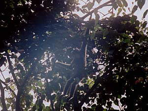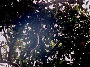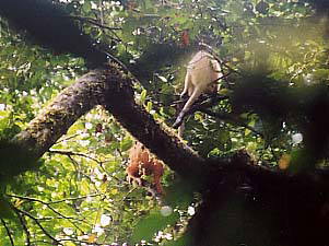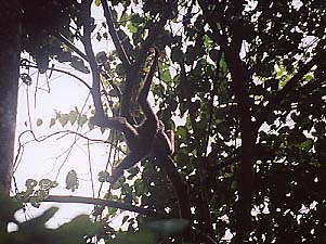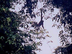 まぁそれはともかく、まずはロッジ下流に架かる橋を目指して歩き始めます‥と、ロッジ敷地の終わりのあたりでYoichiさんグループ発見!どうやら、追い求めているテナガザルの家族が真上にいるようです。ということでしばらくは合流して観察することにします。このグループは4人家族で、Yoichiさんは「SAPAファミリー」と名づけているそうです。詳しくはYoichiさんのサイトへ(私のような素人が見ても相当に楽しめます。オススメ)。