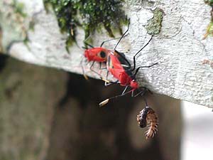 さて、部屋に戻ってみると手すりに何やら赤いものが。何だろうと思ってみてみると、「ただ今交尾&捕食中!」のコンチューくんでした。あのね、ふたまたかけると大体どっちも失敗するっていうからね、どっちかをあきらめなさいって(ちなみにTakemaの経験則というわけではありませんので念のため)。