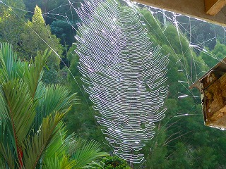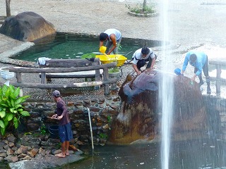 ちなみに対岸の斜面は崩落していましたが(左上画像マウスオンで拡大)、新たな植生が全然見られないところからするとおそらくは今回の雨期に崩れたということなのでしょうかね。右上画像は「この巣の主がどうやって糸を張ったか」をあまりにもわかりやすく説明するものなのですが、このあとお宿の方によって容赦なくはぎ取られたそうです(おしんこどん談)。左上画像マウスオンで出てくる鳥さんはこの宿の建物の隙間にかなり巣を作っているとみました(笑)。 なお、これはこの日たまたまということなのだったのでしょうが、目の前の池(温泉にあらず)と温泉プールとの境あたりを何人もの若者が大掃除していました。 |
