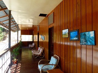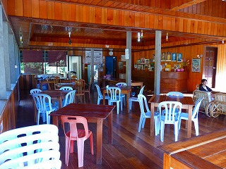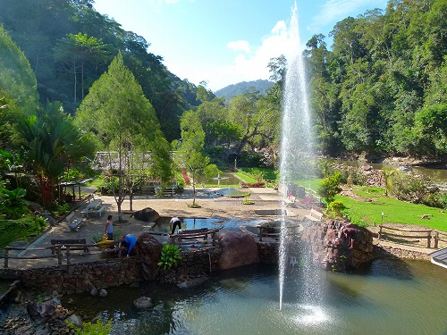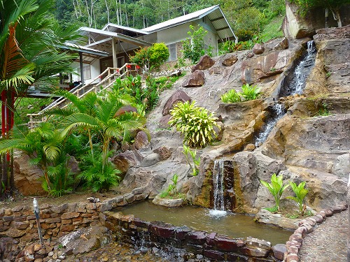 | 明けて翌朝、おはようございます。この日は連泊っていうことでのんびりできますが、どこかのタイミングで源泉探索にいざ出陣という予定になっています。それについてはご主人アルフレッドさんのご予定次第なのですが、まずは昨日は暗くてよくわからなかったお宿の施設についてご紹介いたしましょう。撮影時間がまちまちなので日が当たっていたり陰だったりするのはご容赦下さい。 まずは上画像の噴水どどん。右下画像を見ていただければわかるように、母屋の2F屋根の高さまでたかぁーく吹き上げられております。熱帯の熱さを気分的に少しでも和らげようという趣向なのでしょうが、実は24時間フル稼働でありまして、ロッジのすぐ横を流れる川音とのセットにより夜寝ているときもなかなか賑やかだったりします(まぁすぐ慣れますが)。 |