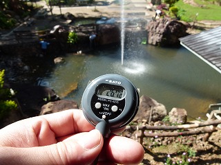 これが何ともかなり念入りで、デッキブラシやたわしで岩に付着した苔をはぎ落とし、いつの間にか着生しつつあった植物などもしっかり抜いていました。なるほどこれは確かにきっちりとした維持管理がなされているのだなと感心した次第です。またTakemaが勝手に名付けた「リラクゼーション1」の浴槽もしっかり湯が抜かれてお掃除&湯の入れ替えがおこなわれていました。でもここまでやってくれるのなら、たぶんしばらく掃除がなされていないあの家族風呂激熱浴槽もゴシゴシやって欲しいなと思ったのはここだけのヒミツです(笑)。 ちなみにまだ朝9時前なのに気温はご覧のとおり。これからさらに気温は上昇することになるのですが‥ |
