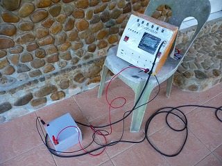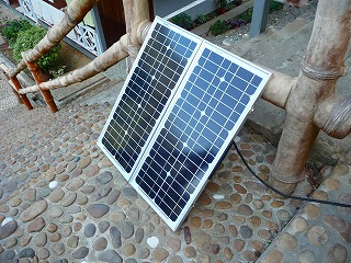 小さなソーラーパネルも発見。こちらでは自家発電で夜間を通して電気が供給されているのですが(ただし部屋に1つしかないコンセントは唯一の快適装備である扇風機に直結せざるを得ないので、部屋にいない時間を除き各種機器の充電はできないかなと。もちろんエアコンやTV、さらには無料Wi-Fi等の便利設備はありません)、こちらはおそらくお宿側プライベートエリア用に充電しているのでしょう。お客がいない日などは自家発電も止めると思われるので。なお日中の電力供給はありません。 で、このあとさんさんザザンと照りつけるであろう熱帯の日射しを予期してか、すでに特等席でのんびりする温泉猫がこんなところに(右上画像マウスオン)。 |