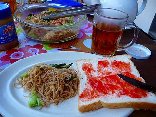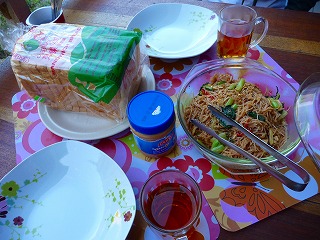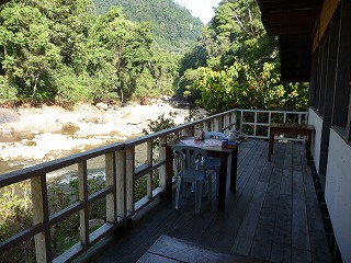 基本的にこちらのお宿の朝食はシンプルです。ビーフンとパン、それにコーヒーか紅茶なのですが、まぁ朝からがっつり食べるつもりもないし、ここは川の流れを眺めながらのんびりまったりしましょ。ただし川の流れは茶色く濁ってます(増水しているのではなくこれがデフォルトカラーかと)。 |