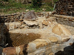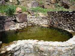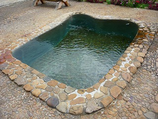 まずは温泉側からロッジを見てみます。左上画像の右側がやや深めのプール、左側がリラクゼーション1浴槽です。しかしリラク1の浴槽はこの時湯を張り替えたばかりということで51.2度の源泉を惜しげもなく投入中、ゆえに湯尻エリアでも47.5度の激熱湯でありました(左上画像マウスオン)。 ところで近くには休憩要のあずまやがあるのですが、ここはそろそろ要メンテナンスなのかなと(屋根材の葉がそこそこ抜け落ちていました)。でもここが整備されれば日中は一番くつろげる場所なのかなと(風が通るので)。 そしてリラクゼーション2浴槽がこちら! |