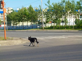 Pカムチャッキーに近づくにつれて車の数も増えてきます。で、右上画像には「カムチャッ犬」の後ろ姿が写ってますが、実はここは信号のある交差点で、この犬はちょうど横断歩道にあたる部分を「青信号で」渡っているのです。ターニャさんいわく「カムチャッカのホームレス犬(野良犬)は信号の意味がわかっているようです」。うーむ、確かにそうかも知れない。でも見方を変えれば「意味を理解しなかった犬たちはみな淘汰されてしまった」その結果なのかもしれませんが(合掌)。