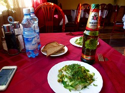 そんなわけで夕食タイムとなりました。今日は(ぬるい)ビールは1本だけにしておきます。実はですね、このレストランでもらえるミネラルウォーターの空きペットボトルに芋焼酎を詰めて持ち込むという荒技を思いついたわけですねただし食事中は自粛、ネットに接続しに来たときだけの話ですが(アバチャホテルではレストランでしか無料無線LAN=スピード激遅、に接続できません)。