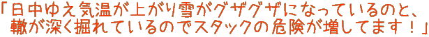 さ、そんなわけでそろそろ来た道を戻ります。途中の雪原走行も今度は下りなので少しは楽‥ということでもなさそうです。というのも‥